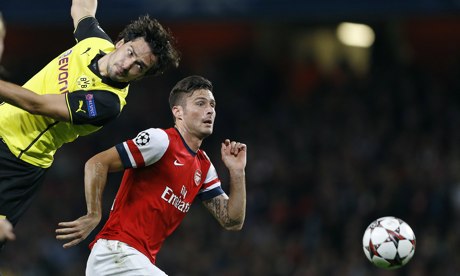 Giroud it was who led the Arsenal fight-back. First he might have won a penalty on 22 minutes, strong-arming his way past Marcel Schmelzer and then luring Mats Hummels into a controlled and deliberate trip. Quarter of an hour later it was Giroud's full-throttle persistence that led to Tomas Rosicky finding space for a shot that Hummels cleared off the line. And on 42 minutes he scored the goal he deserved, seizing on some hesitation between Hummels and Roman Weidenfeller to smash-volley the loose ball into the empty net. Terrible defending, yes, but induced no doubt in part by Giroud's elegant buffeting.