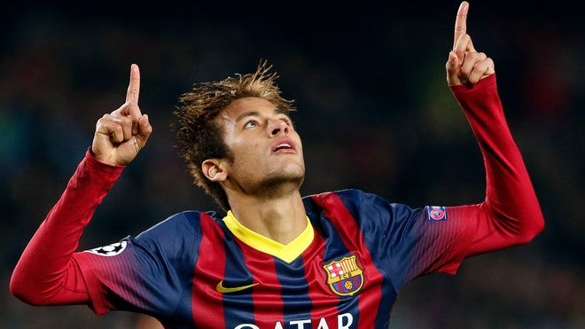 Barcelona's Neymar celebrates after scoring his side's fourth goal during a Group H Champions League soccer match between FC Barcelona and Celtic FC at the Camp Nou stadium in Barcelona, Spain, Wednesday Dec. 11, 2013.(AP Photo/Emilio Morenatti)AP2013